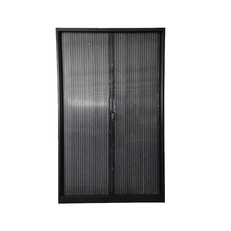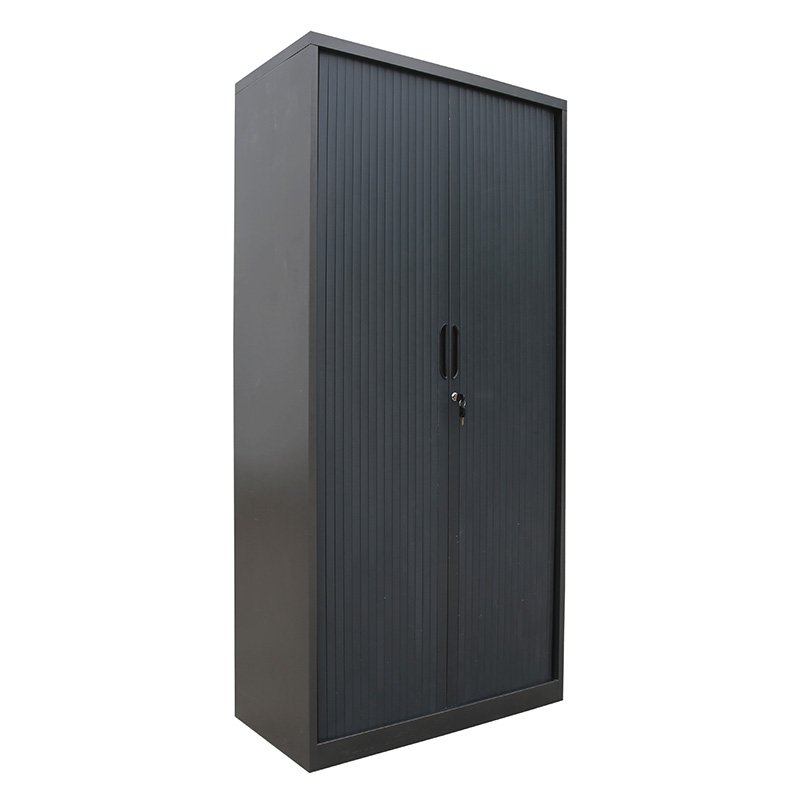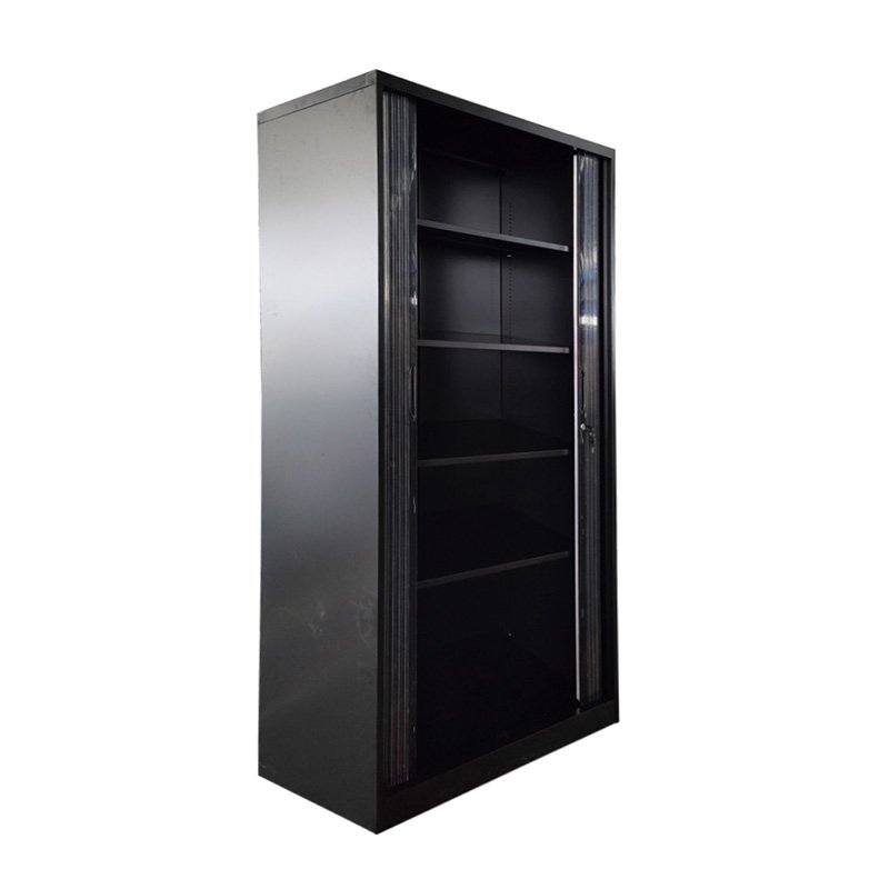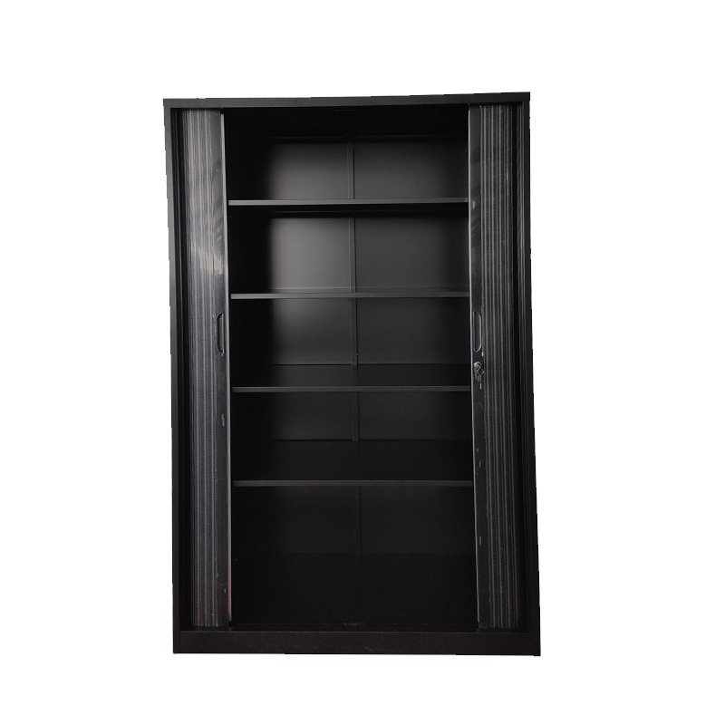 De roldeuren van de kast schuiven soepel opzij, waardoor je gemakkelijk toegang hebt tot de inhoud van de kast zonder extra ruimte voor deuren te hoeven vrijhouden. Binnenin biedt de kast verstelbare planken, waardoor je de indeling naar wens kunt aanpassen om verschillende items zoals mappen, boeken, kantoorbenodigdheden of persoonlijke spullen netjes georganiseerd te houden.