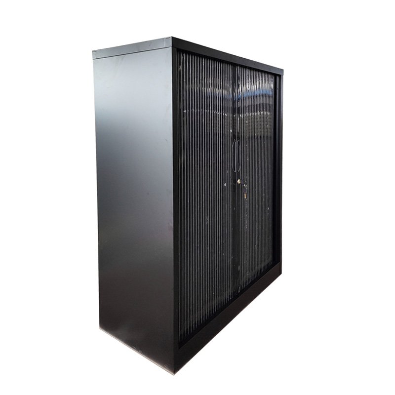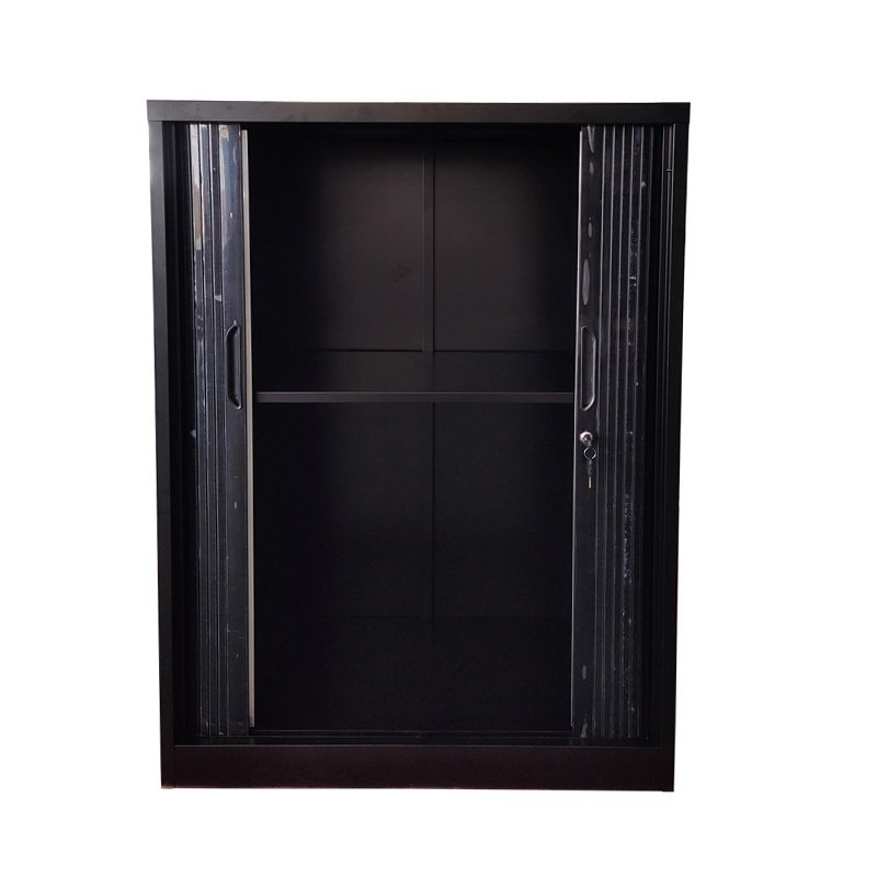 De roldeuren van de kast schuiven soepel opzij, waardoor je gemakkelijk toegang hebt tot de inhoud van de kast zonder extra ruimte voor deuren te hoeven vrijhouden. Binnenin biedt de kast verstelbare planken, waardoor je de indeling naar wens kunt aanpassen om verschillende items zoals mappen, boeken, kantoorbenodigdheden of persoonlijke spullen netjes georganiseerd te houden.