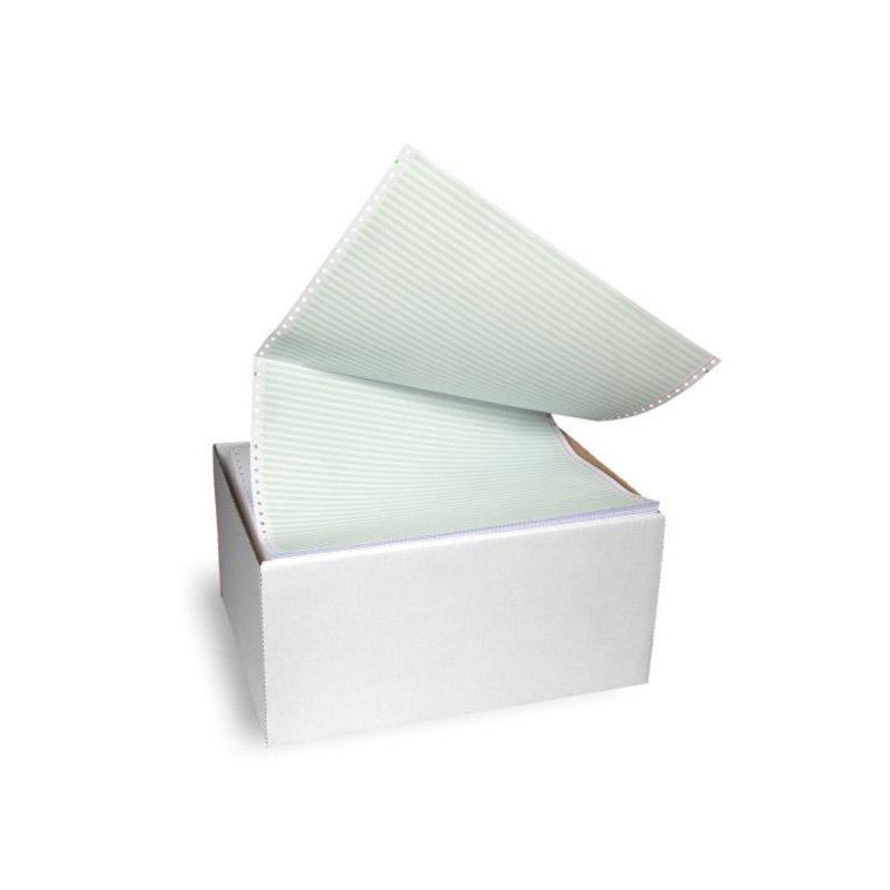 In deze doos ontvang je 750 groen gestreepte vellen 4-voud kettingformulieren die vooraf gescheiden zijn middels een afscheurperforatie. De perforaties liggen op 11inch van elkaar; de afmeting van elk formulier is 14-7/8×11 inch.