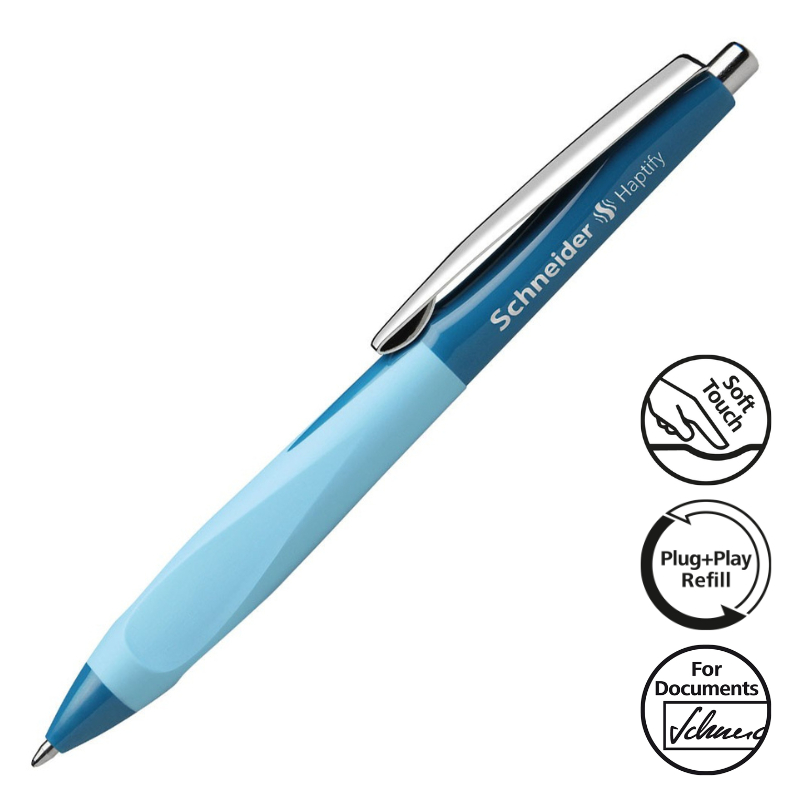 Balpen met ergonomische rubberen driekantige grip voor een ideale positionering in de hand. Vervangbare vulling Express 775 Medium (M) voor buitengewoon makkelijk en glijdend schrijven. Houderkleur cyaan/lichtblauw, Schrijfkleur blauw. Documentecht volgens de inktnorm ISO 12757-2. De slijtvaste roestvrij stalen punt garandeert dat de inkt volledig gebruikt kan worden en vlekvrij is. De Haptify heeft een sterke metalen clip en dankzij het slimme Plug+Play systeem geschikt voor verschillende formaten vullingen.