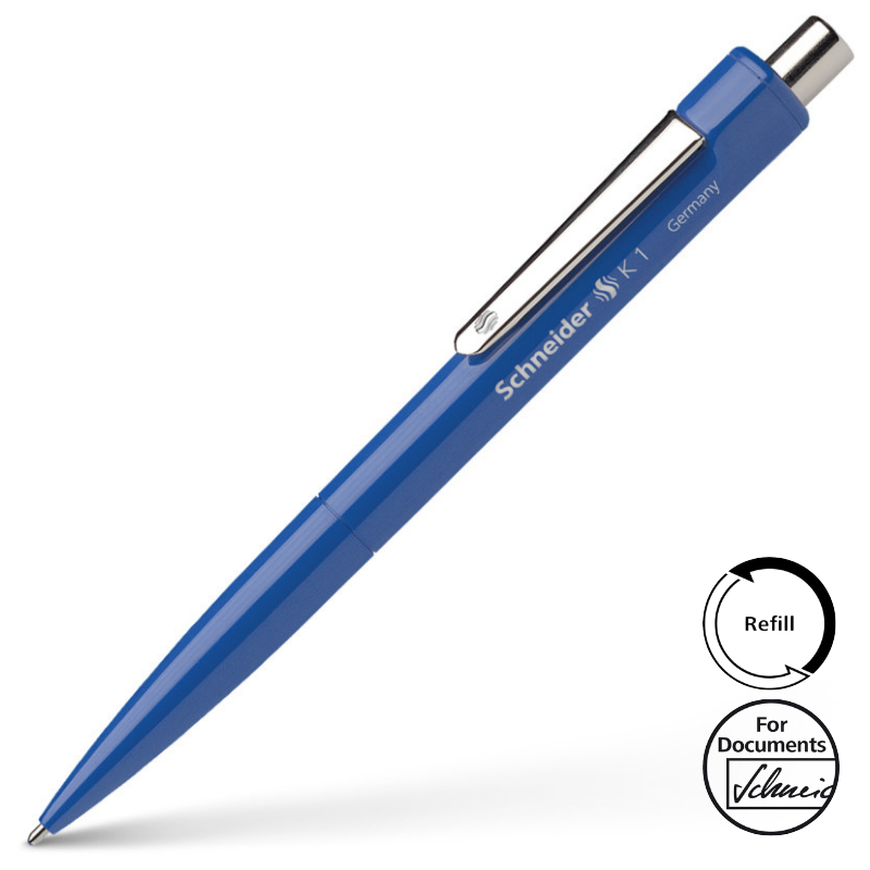 De Schneider “K1” blauw schrijvende drukknop balpen is herbruikbaar, omdat het de optie heeft refilled te worden met de Express 225 en de Express 75. De behuizing van de pen geeft tegelijkertijd ook de kleur inkt aan van de pen. Door de metalen clip van de pen kan hij makkelijk aan uw hemd of broek vast gemaakt worden.