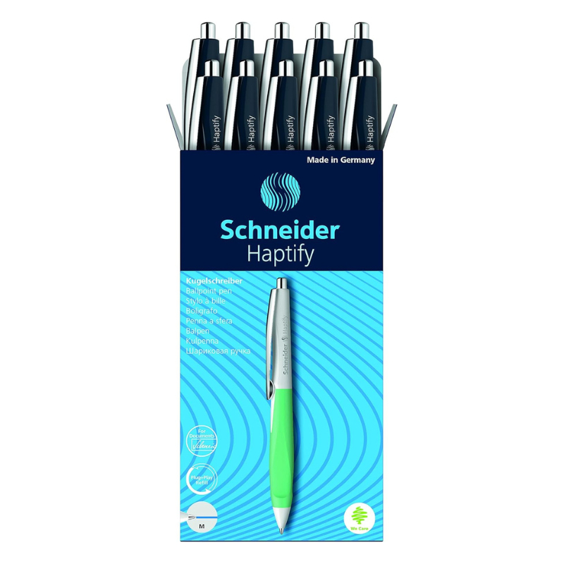 Balpen met ergonomische rubberen driekantige grip voor een ideale positionering in de hand. Vervangbare vulling Express 775 Medium (M) voor buitengewoon makkelijk en glijdend schrijven. Schrijfkleur blauw. Documentecht volgens de inktnorm ISO 12757-2. De slijtvaste roestvrij stalen punt garandeert dat de inkt volledig gebruikt kan worden en vlekvrij is. De Haptify heeft een sterke metalen clip en dankzij het slimme Plug+Play systeem geschikt voor verschillende formaten vullingen.