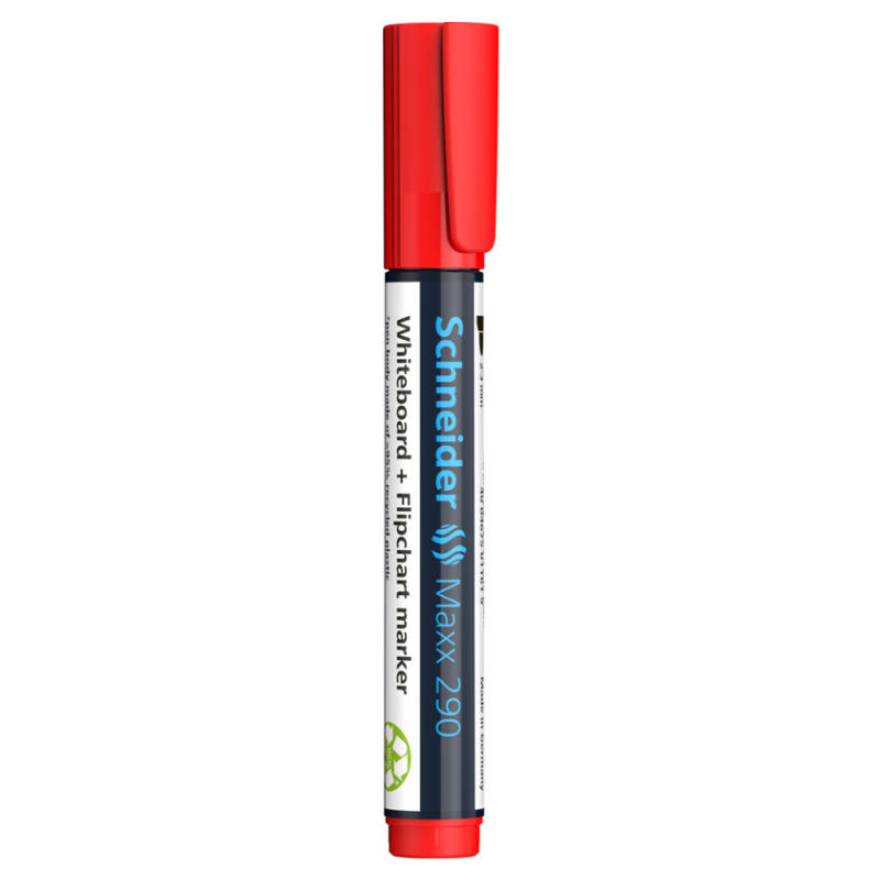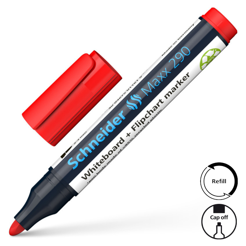 Whiteboard en flipchart marker met ronde punt, lijnbreedte 2 – 3 mm. Schrijfkleur rood. *Behuizing bestaat uit 95% recycling-kunststof. Zowel op een whiteboard als op papier, de sterke, intensieve kleuren zijn makkelijk te lezen, ook achterin de zaal. De inkt kan verwijderd worden van whiteboarden met een droge doek zonder dat er restanten achterblijven en bij flipcharts drukt het niet door op het volgende vel. De Cap-Off inkt droogt niet uit, zelfs niet als de marker 2-3 dagen zonder dop ligt. Het is nagenoeg reukloos en bevat geen Tolueen en Xyleen. De nieuwe grotere houder bevat meer inkt voor maximum resultaat en de nieuwe ronde punt schrijft aangenaam zacht zonder geluid. De Maxx 2990 heeft een praktische dop met clip en kan hervuld worden met Refill Station Maxx 665.
