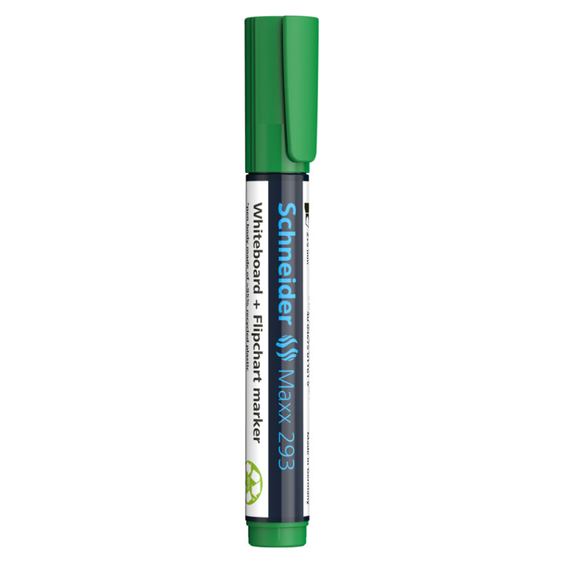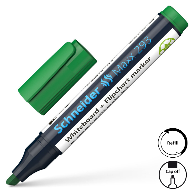 Whiteboard en flipchart marker met beitelpunt, lijnbreedte 2 + 53 mm. Schrijfkleur groen. *Behuizing bestaat uit 95% recycling-kunststof. Zowel op een whiteboard als op papier, de sterke, intensieve kleuren zijn makkelijk te lezen, ook achterin de zaal. De inkt kan verwijderd worden van whiteboarden met een droge doek zonder dat er restanten achterblijven en bij flipcharts drukt het niet door op het volgende vel. De Cap-Off inkt droogt niet uit, zelfs niet als de marker 2-3 dagen zonder dop ligt. Het is nagenoeg reukloos en bevat geen Tolueen en Xyleen. De nieuwe grotere houder bevat meer inkt voor maximum resultaat en de nieuwe ronde punt schrijft aangenaam zacht zonder geluid. De Maxx 2990 heeft een praktische dop met clip en kan hervuld worden met Refill Station Maxx 665.